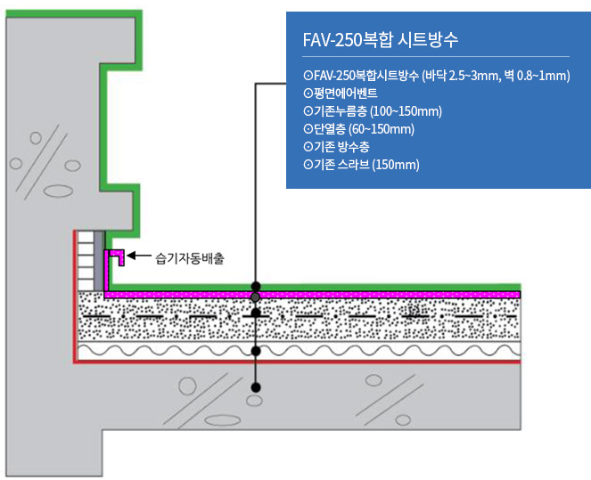 이 문제를 해결하기 위해 배기형 FAV시트(요철형)와 FLAT시트의 조합으로 방수층 내부의
